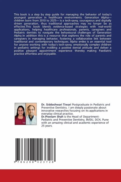 This book is a step by step guide for managing the behavior of today's youngest generation in healthcare environments. Generation Alpha-children born from 2010 to 2025- is a tech-savvy, courageous and digitally driven generation, thus traditional approaches may no longer be as effective.This book blends evidence-based strategies with real-world applications, helping healthcare professionals, parents, caregivers and Pediatric dentists to navigate the behavioural challenges of Generation Alpha.In addition this is a resource that explores the role of parents and caregivers in managing behavior, fostering a collaborative link between traditional and contemporary techniques. Alpha smiles is an essential tool for anyone working with today's tech-savvy, emotionally complex children in pediatric settings for instilling a positive dental attitude and deliver a positive pleasant appointment experience thereby making Paediatric practice effortless and enjoyable.