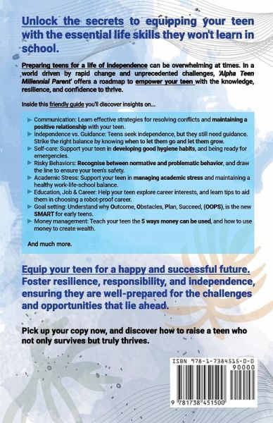 Unlock the secrets to equipping your teen with the essential life skills they won't learn at school. Preparing teens for a life of independence can be overwhelming at times. In a world driven by rapid change and unprecedented challenges, Alpha Teen Millennial Parent offers a road map to empower your teen with the knowledge, resilience, and confidence to thrive. Inside this friendly guide you'll discover insights on: Communication: Learn effective strategies for resolving conflicts and maintaining a positive relationship with your teen. Independence vs. Guidance: Teens seek independence, but they still need guidance. Strike the right balance by knowing when to let them go and let them grow. Self-care: Support your teen in developing good hygiene habits, and being ready for emergencies. Risky Behaviours: Recognise between normative and problematic behaviour, and draw the line to ensure your teen's safety. Academic Stress: Support your teen in managing academic stress and maintaining a healthy work-life-school balance. Education, Job & Career: Help your teen explore career interests, and learn tips to aid them in choosing a robot-proof career. Goal setting: Understand why Outcome, Obstacles, Plan, Succeed, (OOPS), is the new SMART for early teens. Money management: Teach your teen the 5 ways money can be used, and how to use money to create wealth. Equip your teen for a happy and successful future. Foster resilience, responsibility, and independence, ensuring they are well-prepared for the challenges and opportunities that lie ahead. Pick up your copy now, and discover how to raise a teen who not only survives but truly thrives.