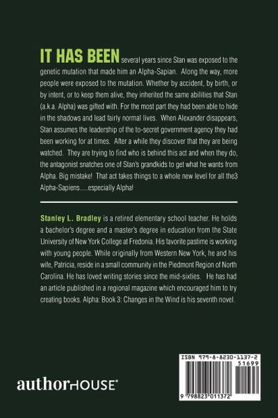 It has been several years since Stan was exposed to the genetic mutation that made him an Alpha-Sapian. Along the way, more people were exposed to the mutation. Whether by accident, by birth, or by intent, or to keep them alive, they inherited the same abilities that Stan (a.k.a. Alpha) was gifted with. For the most part they had been able to hide in the shadows and lead fairly normal lives. When Alexander disappears, Stan assumes the leadership of the to-secret government agency they had been working for at times. After a while they discover that they are being watched. They are trying to find who is behind this act and when they do, the antagonist snatches one of Stan's grandkids to get what he wants from Alpha. Big mistake! That act takes things to a whole new level for all the3 Alpha-Sapiens.....especially Alpha!