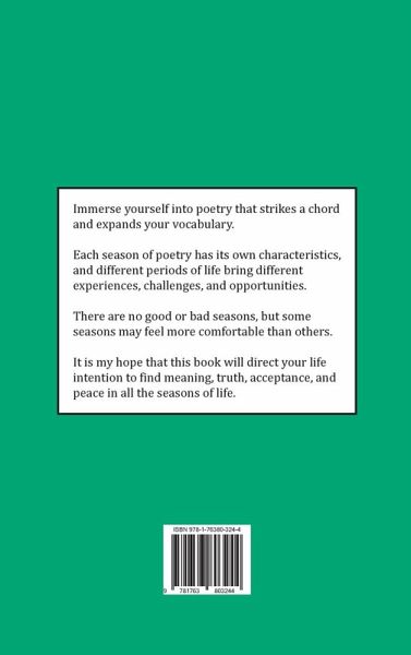Immerse yourself into poetry that strikes a chord and expands your vocabulary. Each season of poetry has its own characteristics, and different periods of life bring different experiences, challenges, and opportunities. There are no good or bad seasons, but some seasons may feel more comfortable than others. It is my hope that this book will direct your life intention to find meaning, truth, acceptance, and peace in all the seasons of life.
