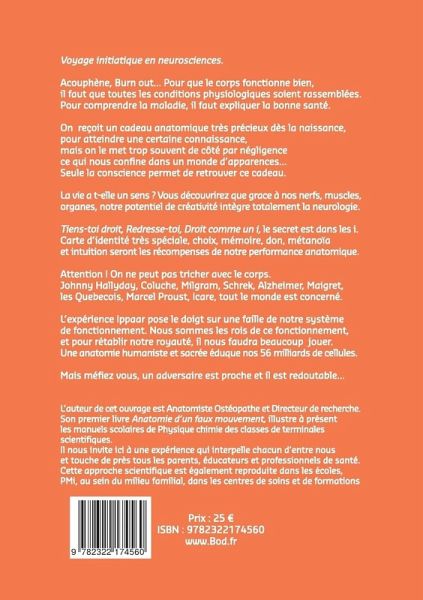 Voyage initiatique en neurosciences :Acouphènes, Burn out, Alzheimer, Diabète ... Pour que le corps fonctionne bien,il faut que toutes les conditions physiologiques soient rassemblées.Pour comprendre la maladie, il faut expliquer la bonne santé.On reçoit un cadeau anatomique très précieux dès la naissance,pour atteindre une certaine connaissance,mais on le met trop souvent de côté par négligencece qui nous confine dans un monde d'apparences...Seule la conscience permet de retrouver ce cadeau.La vie a t-elle un sens ? Vous découvrirez que grace à nos nerfs, muscles,organes, notre potentiel de créativité intègre totalement la neurologie.Tiens-toi droit, Redresse-toi, Droit comme un i, le secret est dans les i.Carte d'identité NeuroSensorielle, choix, mémoire, don, émerveillement, métanoïaet intuition seront les récompenses de notre performance anatomique.Attention ! On ne peut pas tricher avec le corps.Johnny Hallyday, Coluche, Milgram, Icare, les Dyslexiques et les Timides, Schrek, Maigret,les Quebecois, Marcel Proust...tout le monde est concerné.Et vous, comment captez-vous les informations ?L'expérience de neurosciences Ippaar pose le doigt sur une faille de notre systèmede fonctionnement. Nous sommes les rois de ce fonctionnement,et pour rétablir notre royauté, il nous faudra beaucoup jouer.Une anatomie humaniste et sacrée éduque nos 56 milliards de cellules.Mais méfiez vous, un adversaire est proche et il est redoutable...