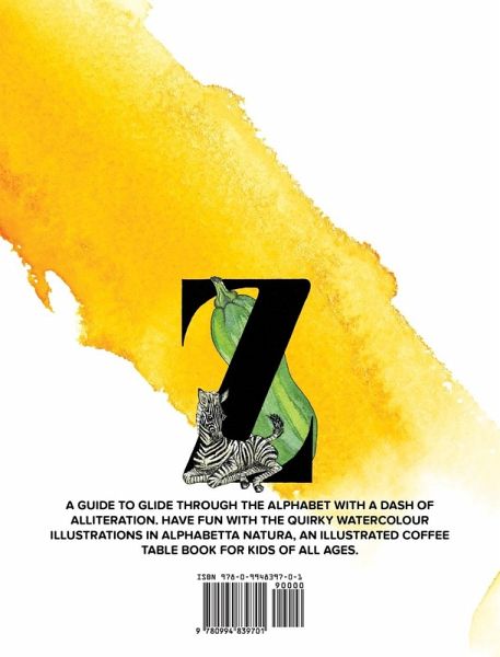 Alphabetta Natura is a hardcover alphabet book, including 26 full colour illustrations. Each full-page illustrated letter of the alphabet includes a unique font, an hodgepodge of alliterated items, and is paired with a dash of unconventionally alliterated prose on the facing page that directly relates to the illustration. The prose runs from a laundry list of items in each illustration, to questions, observations, and the truly bizarre! All prose is appropriate for all ages, with an emphasis on encouraging children to strive for higher and more creative literacy. The original illustrations are done with India ink and watercolour paint on a 300lb Arches cold press paper. Alphabetta Natura was written with everyone in mind, from a young child learning the alphabet, and striving to learn a larger vocabulary, to an adult who enjoys illustrated series work, and quirky prose. Alphabetta Natura can be enjoyed by all ages as an educational tool, as an illustrated coffee table book for everyone, and as a book that grows with you. Alphabetta Natura is a guide to glide through the alphabet with a dash of alliteration. Have fun with the quirky watercolour illustrations in Alphabetta Natura, an illustrated coffee table book for kids of all ages.