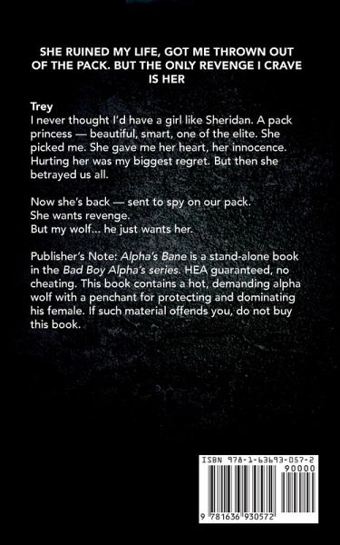 She ruined my life, got me thrown out of the pack. The only revenge I crave is her. Trey I never thought I'd have a girl like Sheridan. A pack princess-beautiful, smart, one of the elite. She picked me. She gave me her heart, her innocence. Hurting her was my biggest regret. But then she betrayed us all. Now she's back-sent to spy on our pack. She wants revenge. But my wolf...he just wants her. Sheridan He crushed my heart and broke my trust. I ruined his life. Now we have to work together, and it's killing me. I want to hate him. But more than that...I want his mark. Alpha's Bane is a stand-alone second-chance shifter romance. No cheating or cliff-hangers.
