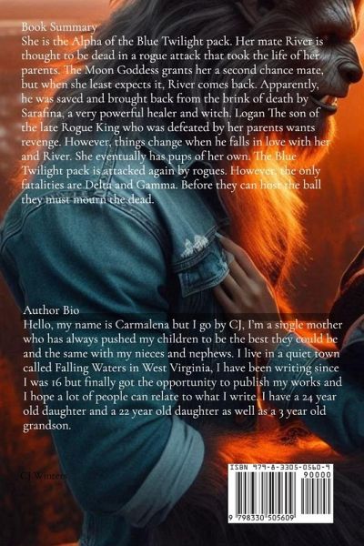She is the Alpha of the Blue Twilight pack. Her mate River is thought to be dead in a rogue attack that took the life of her parents. The Moon Goddess grants her a second chance mate, but when she least expects it, River comes back. Apparently, he was saved and brought back from the brink of death by Sarafina, a very powerful healer and witch. Logan The son of the late Rogue King who was defeated by her parents wants revenge. However, things change when he falls in love with her and River. She eventually has pups of her own. The Blue Twilight pack is attacked again by rogues. However, the only fatalities are the Delta and Gamma. Before they can host the ball they must mourn the dead.