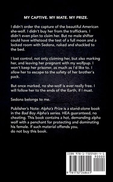 MY CAPTIVE. MY MATE. MY PRIZE. I didn't order the capture of the beautiful American she-wolf. I didn't buy her from the traffickers. I didn't even plan to claim her. But no male shifter could have withstood the test of a full moon and a locked room with Sedona, naked and shackled to the bed. I lost control, not only claiming her, but also marking her, and leaving her pregnant with my wolfpup. I won't keep her prisoner, as much as I'd like to. I allow her to escape to the safety of her brother's pack. But once marked, no she-wolf is ever really free. I will follow her to the ends of the Earth, if I must. Sedona belongs to me. Publisher's Note: Alpha's Prize is a stand-alone book in the Bad Boy Alphas series. HEA guaranteed, no cheating. This book contains a hot, demanding alpha wolf with a penchant for protecting and dominating his female. If such material offends you, do not buy this book.