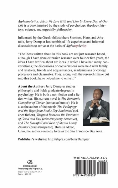 Alphatopbetics: Ideas We Live With and Live by Every Day of Our Life is a book inspired by the study of psychology, theology, history, science, and especially philosophy. Influenced by the Greek philosophers Socrates, Plato, and Aristotle, Jerry Dampier has combined life experience and informal discussions to arrive at the basis of Alphatopbetics. "The ideas written about in this book are not just research based, although I have done extensive research over four or five years, the ideas I have written about are ideas in which I have had many conversations; the discussions or conversations were held with family and relatives, friends and acquaintances, academicians or college professors and classmates. They, along with the research I have put into this book, have helped me to write it." About the Author: Jerry Dampier studies philosophy and holds graduate degrees in psychology. He is both a non-fiction and a fiction writer. His current novel is The Romantic Comedies of Clover (romance/humor). He is also the author of the novels The Pedagogy and the Boys from Beal Alley Boulevard (science fiction), Trapped Between the Extremes of Good and Evil (crime/mystery detective), and The Downfall and Rise of Steven Leroy Zienner (drama/suspense). Born in Akron, Ohio, the author currently lives in the San Francisco Bay Area. Publisher's website: http://sbpra.com/JerryDampier