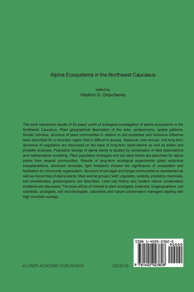"This volume contains the main results of 20 years of fieldwork in the northwest Caucasus. ... it can serve as a solid basis for further research and monitoring in alpine environments ... . The book combines a comprehensive overview with the results of in-depth research. ... the volume may be recommended for all interested in the Caucasus and in high mountain ecology in general, as it presents a rich diversity of scientific approaches to the study of relevant topics." (Jörg Stadelbauer, Mountain Research and Development, Vol. 25 (3), 2005)