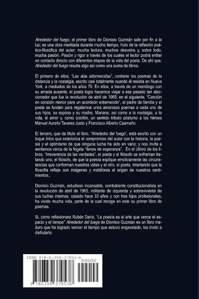 Alrededor del fuego, el primer libro de Dionisio Guzmán sale por fin a la luz; es una obra meditada durante mucho tiempo, fruto de la reflexión poético-filosófica del autor: mucha lectura, muchos desvelos y, sobre todo, mucha pasión. Pasión y rigor a través de los cuales el lector podrá entrar en contacto directo con diferentes etapas de la vida del poeta. De ahí que, Alrededor del fuego resulte algo así como una suma de libros. Dionisio Antonio Guzmán, estudioso incansable, obtuvo una Licenciatura en Filosofía y Letras de la Universidad Autónoma de Santo Domingo en 1972; en esa misma universidad se tituló de Ingeniero Electromecánico en 1976. En 1999 se graduó de Ingeniero Civil de la Universidad O&M. Combatiente constitucionalista en la revolución de abril de 1965, militante de izquierda y sobreviviente de sus luchas internas, casado hace 33 años y con tres hijos profesionales, ha vivido mucha vida, parte de la cual recoge en este su primer libro de poemas.