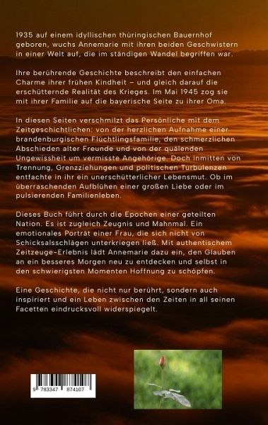 1935 auf einem idyllischen thüringischen Bauernhof geboren, wuchs Annemarie mit ihren beiden Geschwistern in einer Welt auf, die im ständigen Wandel begriffen war. In ihrer berührenden Geschichte beschreibt sie den einfachen Charme ihrer frühen Kindheit - und gleich darauf die erschütternde Realität des Krieges. Im Mai 1945 zog sie mit ihrer Familie auf die bayerische Seite zu ihrer Oma.In diesen Seiten verschmilzt das Persönliche mit dem Zeitgeschichtlichen: Annemarie berichtet von der herzlichen Aufnahme einer brandenburgischen Flüchtlingsfamilie, den schmerzlichen Abschieden alter Freunde und von der quälenden Ungewissheit um vermisste Angehörige. Doch inmitten von Trennung, Grenzziehungen und politischen Turbulenzen entfachte in ihr ein unerschütterlicher Lebensmut. Ob im überraschenden Aufblühen einer großen Liebe oder im pulsierenden Familienleben: Dieses Buch führt den Leser auf eine faszinierende Reise durch die Epochen einer geteilten Nation. Es ist zugleich Zeugnis und Mahnmal, ein emotionales Porträt einer Frau, die sich nicht von Schicksalsschlägen unterkriegen ließ. Mit authentischem Zeitzeuge-Erlebnis lädt Annemarie dazu ein, den Glauben an ein besseres Morgen neu zu entdecken und selbst in den schwierigsten Momenten Hoffnung zu schöpfen.Erleben Sie eine Geschichte, die nicht nur berührt, sondern auch inspiriert. Ein Buch, das ein Leben zwischen den Zeiten in all seinen Facetten eindrucksvoll widerspiegelt.