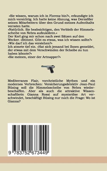 Mediterranes Flair, vorchristliche Mythen und ein modernes Verbrechen: Versicherungsdetektiv Jean-Paul Büsing soll die Himmelsscheibe von Nebra wiederbeschaffen. Aber als auch die attraktive Wissenschaftlerin Gianna Rossi auf mysteriöse Art verschwindet, beschäftigt Büsing nur noch die Frage: Wo ist Gianna?