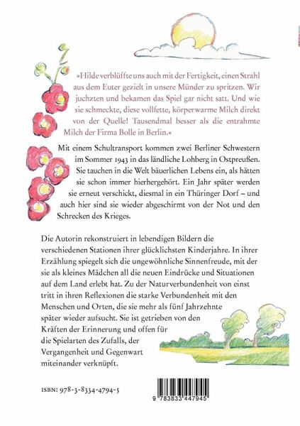 "Hilde verblüffte uns auch mit der Fertigkeit, einen Strahl aus dem Euter gezielt in unsere Münder zu spritzen. Wir juchzten und bekamen das Spiel gar nicht satt. Und wie sie schmeckte, diese vollfette, körperwarme Milch direkt von der Quelle! Tausendmal besser als die entrahmte Milch der Firma Bolle in Berlin."Mit einem Schultransport kommen zwei Berliner Schwestern im Sommer 1943 in das ländliche Lohberg in Ostpreußen. Sie tauchen in die Welt bäuerlichen Lebens ein, als hätten sie schon immer hierhergehört. Ein Jahr später werden sie erneut verschickt, diesmal in ein Thüringer Dorf - und auch hier sind sie wieder abgeschirmt von der Not und den Schrecken des Krieges.Die Autorin rekonstruiert in lebendigen Bildern die verschiedenen Stationen ihrer glücklichsten Kinderjahre. In ihrer Erzählung spiegelt sich die ungewöhnliche Sinnenfreude, mit der sie als kleines Mädchen all die neuen Eindrücke und Situationen auf dem Land erlebt hat. Zu der Naturverbundenheit von einst tritt in ihren Reflexionen die starke Verbundenheit mit den Menschen und Orten, die sie mehr als fünf Jahrzehnte später wieder aufsucht. Sie ist getrieben von den Kräften der Erinnerung und offen für die Spielarten des Zufalls, der Vergangenheit und Gegenwart miteinander verknüpft.