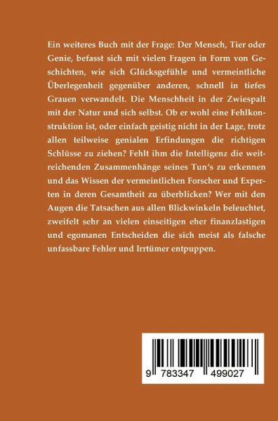 Ein weiteres Buch mit der Frage: Der Mensch, Tier oder Genie, befasst sich mit vielen Fragen in Form von Geschichten, wie sich Glücksgefühle und vermeintliche Überlegenheit gegenüber anderen, schnell in tiefes Grauen verwandelt. Die Menschheit in der Zwiespalt mit der Natur und sich selbst. Ob er wohl eine Fehlkonstruktion ist, oder einfach geistig nicht in der Lage, trotz allen teilweise genialen Erfindungen die richtigen Schlüsse zu ziehen? Fehlt ihm die Intelligenz die weitreichenden Zusammenhänge seines Tun's zu erkennen und das Wissen der vermeintlichen Forscher und Experten in deren Gesamtheit zu überblicken? Wer mit den Augen die Tatsachen aus allen Blickwinkeln beleuchtet, zweifelt sehr an vielen einseitigen eher finanzlastigen und egomanen Entscheiden die sich meist als falsche unfassbare Fehler und Irrtümer entpuppen.