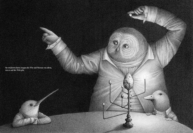 Diese Geschichte, dargestellt in wunderschönen Illustrationen in schwarz und weiß, bietet viel Stoff zum Nachdenken über die Entwicklung einer Gesellschaft. 'Als die Vögel vergaßen, Vögel zu sein' mit dem Originaltitel 'Bandada' gewann den '5. Internationalen Preis von Compostela für illustrierte Bücher'.