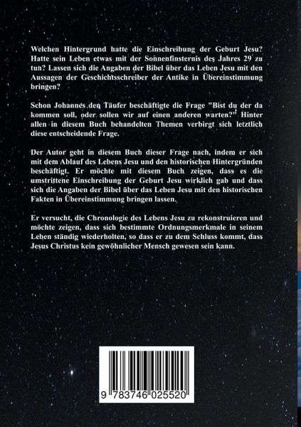 Welchen Hintergrund hatte die Einschreibung der Geburt Jesu?Hatte sein Leben etwas mit der Sonnenfinsternis des Jahres 29 zu tun? Lassen sich die Angaben der Bibel über das Leben Jesu mit den Aussagen der Geschichtsschreiber der Antike in Übereinstimmung bringen?Schon Johannes den Täufer beschäftigte die Frage "Bist du der da kommen soll, oder sollen wir auf einen anderen warten?" Hinter allen in diesem Buch behandelten Themen verbirgt sich letztlich diese entscheidende Frage. Der Autor geht in diesem Buch dieser Frage nach, indem er sich mit dem Ablauf des Lebens Jesu und den historischen Hintergründen beschäftigt. Er möchte mit diesem Buch zeigen, dass es die umstrittene Einschreibung der Geburt Jesu wirklich gab und dass sich die Angaben der Bibel über das Leben Jesu mit den historischen Fakten in Übereinstimmung bringen lassen.Er versucht, die Chronologie des Lebens Jesu zu rekonstruieren und möchte zeigen, dass sich bestimmte Ordnungsmerkmale in seinem Leben ständig wiederholten, so dass er zu dem Schluss kommt, dass Jesus Christus kein gewöhnlicher Mensch gewesen sein kann.