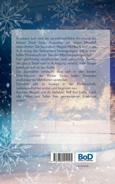 In diesem Jahr wird die vorweihnachtliche Stimmung der kleinen Stadt Sankt Augustine von einem Mordfall überschattet. Die Journalistin Abigail Mühlberg wird in die Aufklärung des Verbrechens hineingezogen, das in einer hellen Mondnacht am See des Märchenparks geschah.Fast gleichzeitig verschwinden zwei zehnjährige Kinder, die ganze Stadt wird in Aufregung versetzt, viele Bürger beteiligen sich an der Suche.Die Journalistin entdeckt, dass sich in den beiden Elternhäusern der Kinder hinter heilen Fassaden erschreckende Wahrheiten verstecken.Daneben gibt es Irrwege in der Partnerschaft, Liebesgeschichten enden und beginnen neu.Konnten Abigail und ihr Verlobter Rolf ihre Liebe durch alle Höhen und Tiefen ihrer gemeinsamen Erlebnisse retten?