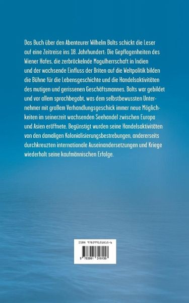 Das Buch über den Abenteurer Wilhelm Bolts schickt die Leser auf eine Zeitreise ins 18. Jahrhundert: Die Gepflogenheiten des Wiener Hofes, die zerbröckelnde Mogulherrschaft in Indien und der wachsende Einfluss der Briten auf die Weltpolitik bilden die Bühne für die Lebensgeschichte und die Handelsaktivitäten des mutigen und gerissenen Geschäftsmannes. Bolts war gebildet und vor allem sprachbegabt, was dem selbstbewussten Unternehmer mit großem Verhandlungsgeschick immer neue Möglichkeiten im seinerzeit wachsenden Seehandel zwischen Europa und Asien eröffnete. Begünstigt wurden seine Handelsaktivitäten von den damaligen Kolonialisierungsbestrebungen, andererseits durchkreuzten internationale Auseinandersetzungen und Kriege wiederholt seine kaufmännischen Erfolge.