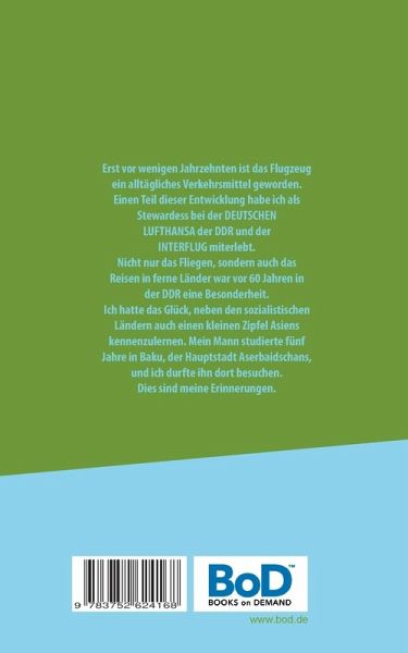 Erst vor wenigen Jahrzehnten ist das Flugzeug ein alltägliches Verkehrsmittel geworden. Einen Teil dieser Entwicklung habe ich als Stewardess bei der DEUTSCHEN LUFTHANSA der DDR und der INTERFLUG miterlebt. Nicht nur das Fliegen, sondern auch das Reisen in ferne Länder war vor 60 Jahren in der DDR eine Besonderheit. Ich hatte das Glück, neben den sozialistischen Ländern auch einen kleinen Zipfel Asiens kennenzulernen. Mein Mann studierte fünf Jahre in Baku, der Hauptstadt Aserbaidschans, und ich durfte ihn dort besuchen. Dies sind meine Erinnerungen.