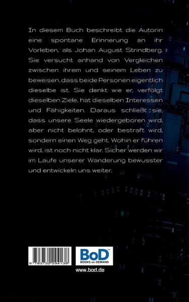 In diesem Buch beschreibt die Autorin eine spontane Erinnerung an ihr Vorleben als Johan August Strindberg. Sie versucht anhand von Vergleichen zwischen ihrem und seinem Leben zu beweisen, dass beide Personen eigentlich dieselbe ist. Sie denkt wie er, verfolgt dieselben Ziele, hat dieselben Interessen und Fähigkeiten. Daraus schließt sie, dass unsere Seele wiedergeboren wird, aber nicht belohnt, oder bestraft wird, sondern einen Weg geht. Wohin er führen wird, ist noch nicht klar. Sicher werden wir im Laufe unserer Wanderung bewusster und entwickeln uns weiter.