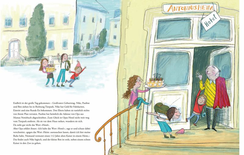 Opa behauptet, er sei der Kaiser von China. Und er sagt, er wohne in einem Hotel. Aber als Pauline, Ben und Nike mit ihrem Opa in den Zoo wollen, steht an dem Hotel sowas wie Heim. Egal. Am Kassenhäuschen vom Zoo ist Opa dann plötzlich verschwunden. Was nun? Die Enkel suchen ihn überall. Im Raubtierhaus trauen sie ihren Augen nicht. Ist das wirklich ihr Opa, der da die plötzlich ganz friedlichen Löwen füttert? Mit diesem Opa ist es nie langweilig und die drei Enkelkinder nehmen ihn so, wie er ist. Auch wenn die Phantasie mit ihm manchmal ganz schön durchgeht und es ordentlich turbulent werden kann.