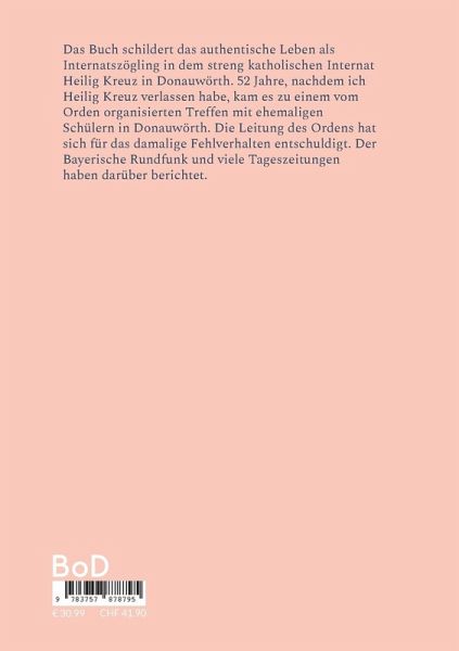 Das Buch schildert das authentische Leben als Internatszögling in dem streng katholischen Internat Heilig Kreuz in Donauwörth. 52 Jahre, nachdem ich Heilig Kreuz verlassen habe, kam es zu einem vom Orden organisierten Treffen mit ehemaligen Schülern in Donauwörth. Die Leitung des Ordens hat sich für das damalige Fehlverhalten entschuldigt. Der Bayerische Rundfunk und viele Tageszeitungen haben darüber berichtet.
