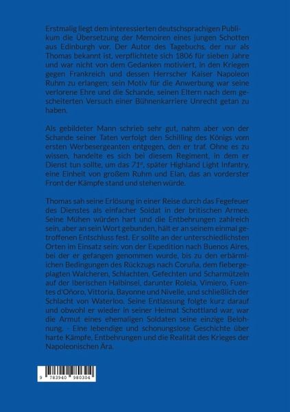 Erstmalig liegt dem interessierten deutschsprachigen Publikum die Übersetzung der Memoiren eines jungen Schotten aus Edinburgh vor. Der Autor des Tagebuchs, der nur als Thomas bekannt ist, verpflichtete sich 1806 für sieben Jahre und war nicht von dem Gedanken motiviert, in den Kriegen gegen Frankreich und dessen Herrscher Kaiser Napoleon Ruhm zu erlangen; sein Motiv für die Anwerbung war seine verlorene Ehre und die Schande, seinen Eltern nach dem gescheiterten Versuch einer Bühnenkarriere Unrecht getan zu haben. Als gebildeter Mann schrieb sehr gut, nahm aber von der Schande seiner Taten verfolgt den Schilling des Königs vom ersten Werbesergeanten entgegen, den er traf. Ohne es zu wissen, handelte es sich bei diesem Regiment, in dem er Dienst tun sollte, um das 71st, später Highland Light Infantry, eine Einheit von großem Ruhm und Elan, das an vorderster Front der Kämpfe stand und stehen würde. Thomas sah seine Erlösung in einer Reise durch das Fegefeuer des Dienstes als einfacher Soldat in der britischen Armee. Seine Mühen würden hart und die Entbehrungen zahlreich sein, aber an sein Wort gebunden, hält er an seinem einmal getroffenen Entschluss fest. Er sollte an der unterschiedlichsten Orten im Einsatz sein: von der Expedition nach Buenos Aires, bei der er gefangen genommen wurde, bis zu den erbärmlichen Bedingungen des Rückzugs nach Coruña, dem fiebergeplagten Walcheren, Schlachten, Gefechten und Scharmützeln auf der Iberischen Halbinsel, darunter Roleia, Vimiero, Fuentes d'Oñoro, Vittoria, Bayonne und Nivelle, und schließlich der Schlacht von Waterloo. Seine Entlassung folgte kurz darauf und obwohl er wieder in seiner Heimat Schottland war, war die Armut eines ehemaligen Soldaten seine einzige Belohnung. - Eine lebendige und schonungslose Geschichte über harte Kämpfe, Entbehrungen und die Realität des Krieges der Napoleonischen Ära.