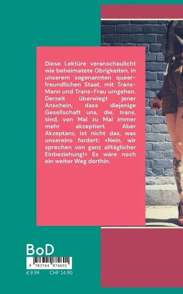 Diese Lektüre veranschaulicht wie beheimatete Obrigkeiten, in unserem sogenannten queer-freundlichen Staat, mit Trans-Mann und Trans-Frau umgehen. Derzeit überwiegt jener Anschein, dass diejenige Gesellschaft uns, die, trans, sind, von Mal zu Mal immer mehr akzeptiert. Aber Akzeptanz, ist nicht das, was unsereins fordert: »Nein, wir sprechen von ganz alltäglicher Einbeziehung!« Es wäre noch ein weiter Weg dorthin.
