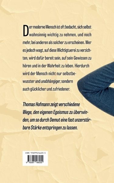 Der moderne Mensch ist oft bedacht, sich selbst wahnsinnig wichtig zu nehmen, und noch mehr, bei anderen als solcher zu erscheinen. Wer es jedoch wagt, auf diese Wichtigtuerei zu verzichten, wird dafür bereit sein, auf sein Gewissen zu hören und in der Wahrheit zu leben. Hierdurch wird der Mensch nicht nur selbstbewusster und unabhängiger, sondern auch glücklicher und zufriedener. Thomas Hofmann zeigt verschiedene Wege, den eigenen Egoismus zu überwinden, um so durch Demut eine fast unzerstörbare Stärke entspringen zu lassen.
