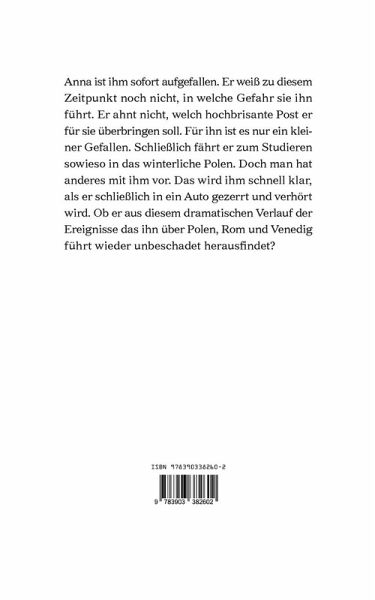 Anna ist ihm sofort aufgefallen. Er weiß zu diesem Zeitpunkt noch nicht, in welche Gefahr sie ihn führt. Er ahnt nicht, welch hochbrisante Post er für sie überbringen soll. Für ihn ist es nur ein kleiner Gefallen. Schließlich fährt er zum Studieren sowieso in das winterliche Polen.Doch man hat anderes mit ihm vor. Das wird ihm schnell klar, als er schließlich in ein Auto gezerrt und verhört wird. Ob er aus diesem dramatischen Verlauf der Ereignisse das ihn über Polen, Rom und Venedig führt wieder unbeschadet herausfindet?
