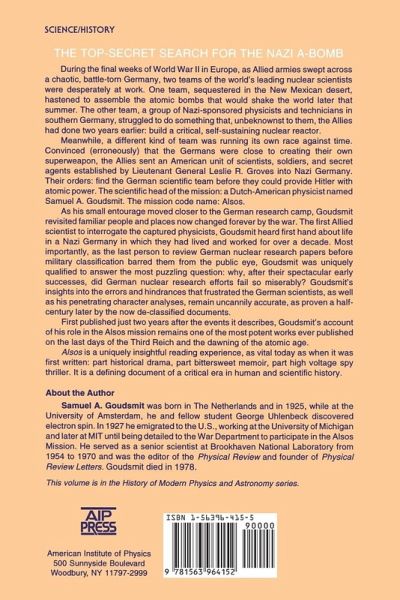Alsos was a scientific intelligence mission launched by the Allies in the autumn of 1943 to determine the progress of German research on the atom bomb. With the suspense of a thriller, Goudsmit recounts the circumstances leading up to the mission, the methods its participants used to do their scientific sleuthing, and the reaction of the German scientists on the day the atom bomb fell on Hiroshima. With a new introduction by David Cassidy About the Author: Samuel Goudsmit was born in The Netherlands and in 1925 he and fellow student George Uhlenbeck discovered electron spin. In 1927 he emigrated to the U.S., working at the University of Michigan and later at MIT until being detailed to the War Department to participate in the Alsos Mission. He served as a senior scientist at Brookhaven National Laboratory from 1954 to 1970 and was the founder of Physical Review Letters.
