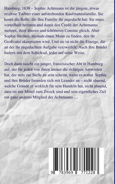 Hamburg, 1838 - Sophie Achtmann ist die jüngste, etwas reizlose Tochter einer aufstrebenden Kaufmannsfamilie. Sie kennt die Rolle, die ihre Familie ihr zugedacht hat: Sie muss vorteilhaft heiraten und damit den Credit der Achtmanns mehren, ihrer älteren und schöneren Cousine gleich. Aber Sophie fürchtet, niemals einen Mann zu finden, den ihr Großvater akzeptieren wird. Und sie ist nicht die Einzige, die an der ihr zugedachten Aufgabe verzweifelt: Auch ihre Brüder hadern mit dem Schicksal, jeder auf seine Weise.Doch dann taucht ein junger, französischer Abt in Hamburg auf, der für jeden von ihnen immer die richtigen Antworten hat, der stets zur Stelle zu sein scheint, wenn es nottut. Sophie und ihre Brüder freunden sich mit Leander an - nicht ahnend, welche Gründe er wirklich für sein Handeln hat, nicht ahnend, dass sie nur Mittel zum Zweck sind und sein eigentliches Ziel ein ganz anderes Mitglied der Achtmanns ...