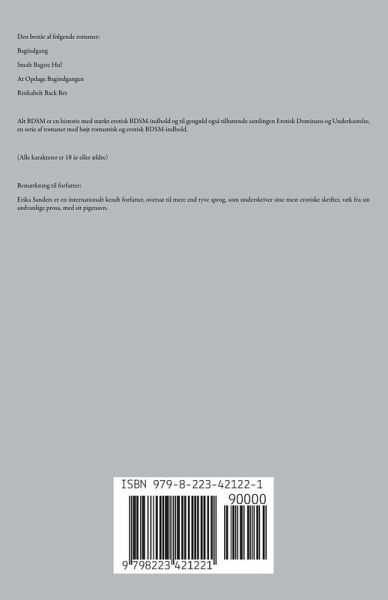 Den består af følgende romaner: Bagindgang Smalt Bagste Hul At Opdage Bagindgangen Risikabelt Back Bet Alt BDSM er en historie med stærkt erotisk BDSM-indhold og til gengæld også tilhørende samlingen Erotisk Dominans og Underkastelse, en serie af romaner med højt romantisk og erotisk BDSM-indhold. (Alle karakterer er 18 år eller ældre) Bemærkning til forfatter: Erika Sanders er en internationalt kendt forfatter, oversat til mere end tyve sprog, som underskriver sine mest erotiske skrifter, væk fra sin sædvanlige prosa, med sit pigenavn.