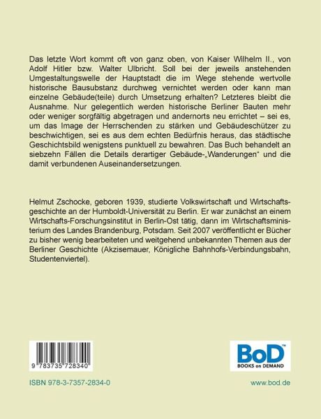 Das letzte Wort kommt oft von ganz oben, von Kaiser Wilhelm II., von Adolf Hitler bzw. Walter Ulbricht. Soll bei der jeweils anstehenden Umgestaltungswelle der Hauptstadt die im Wege stehende wertvolle historische Bausubstanz durchweg vernichtet werden oder kann man einzelne Gebäude(teile) durch Umsetzung erhalten? Letzteres bleibt die Ausnahme. Nur gelegentlich werden historische Berliner Bauten mehr oder weniger sorgfältig abgetragen und andernorts neu errichtet - sei es, um das Image der Herrschenden zu stärken und Gebäudeschützer zu beschwichtigen, sei es aus dem echten Bedürfnis heraus, das städtische Geschichtsbild wenigstens punktuell zu bewahren. Das Buch behandelt an siebzehn Fällen die Details derartiger Gebäude-"Wanderungen" und die damit verbundenen Auseinandersetzungen.