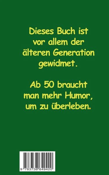 In diesem Buch findet der Leser rund um das Alter humorvolle Reime, Witze und originelle Kurztexte. Es eignet sich ganz besonders als Geschenk zu Geburtstagen, Renteneintritt oder auch als Mitbringsel für die ältere Generation. Nicht zu vergessen: Besonders ab 50 braucht man viel Humor, um angenehmer zu leben!