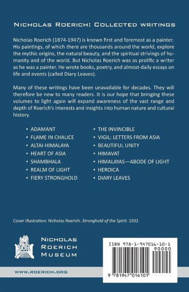 An inspiring record of the Roerich Central Asiatic Expedition(1924-1928) to India, Sikkim, Little Tibet, Chinese Turkestan, Mongoliaand Tibet. Nicholas Roerich (1874-1947) is known first and foremost as a painter. His paintings, of which there are thousands around the world, explore the mythic origins, the natural beauty, and the spiritual strivings of humanity and of the world. But Nicholas Roerich was as prolific a writer as he was a painter. He wrote books, poetry, and almost-daily essays on life and events (called Diary Leaves). Many of these writings have been unavailable for decades. They will therefore be new to many readers. It is our hope that bringing these volumes to light again will expand awareness of the vast range and depth of Roerich's interests and insights into human nature and cultural history.