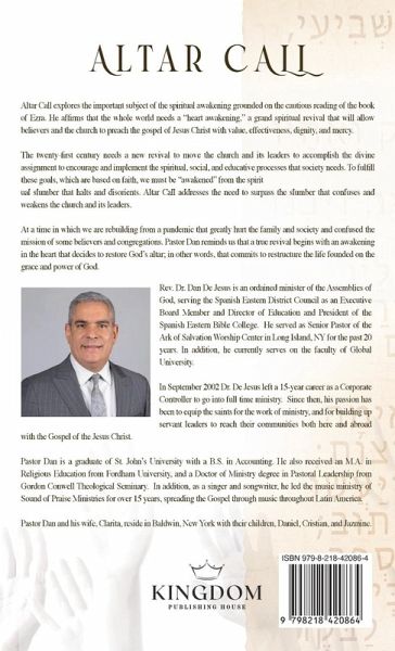 Altar Call explores the important subject of the spiritual awakening grounded on the cautious reading of the book of Ezra. He affirms that the whole world needs a "heart awakening," a grand spiritual revival that will allow believers and the church to preach the gospel of Jesus Christ with value, effectiveness, dignity, and mercy. The twenty-first century needs a new revival to move the church and its leaders to accomplish the divine assignment to encourage and implement the spiritual, social, and educative processes that society needs. To fulfill these goals, which are based on faith, we must be "awakened" from the spiritual slumber that halts and disorients. Altar Call addresses the need to surpass the slumber that confuses and weakens the church and its leaders. At a time in which we are rebuilding from a pandemic that greatly hurt the family and society and confused the mission of some believers and congregations. Pastor Dan reminds us that a true revival begins with an awakening in the heart that decides to restore God's altar; in other words, that commits to restructure the life founded on the grace and power of God.