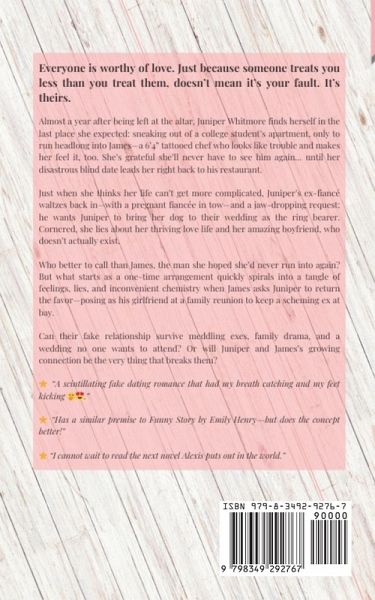 Almost a year after being left at the altar, Juniper Whitmore finds herself waking from a rendezvous with a twenty-two-year-old college student. She does her walk of shame looking like a train wreck through a convenience store where she runs into - quite literally - a 6'4" tattooed hottie named James. Full of embarrassment, she thanks the universe she won't ever have to see him again... until she runs into him again at his restaurant during a horrible blind date. Later, Juniper's ex-fiancé shows up at her work with his pregnant fiancée to ask Juniper to take back her dog on the stipulation that she brings him to their wedding to be their ring bearer. She catches herself agreeing to go and lying about her happy life with her nonexistent boyfriend. So, who does she call when she needs a fake date? James, the man she never wanted to see again. Eventually, James asks her to return the favor to fend off a life ruining ex-girlfriend at a family reunion, who does whatever she can to get in the way. Will their fake relationship blossom into more or will the events of the family reunion and Juniper's ex-fiancé be a dealbreaker for them?