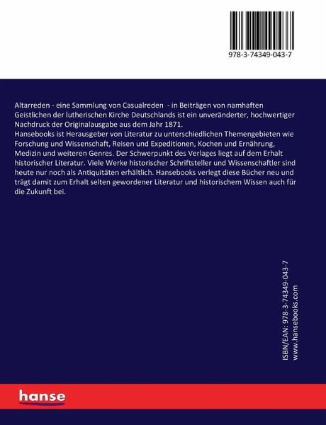 Altarreden - eine Sammlung von Casualreden - in Beiträgen von namhaften Geistlichen der lutherischen Kirche Deutschlands ist ein unveränderter, hochwertiger Nachdruck der Originalausgabe aus dem Jahr 1871.