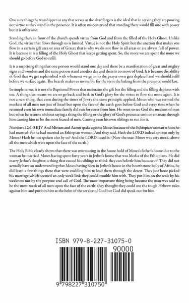 One sure thing the worshipper or any that serves at the altar forgets is the ideal that in serving they are pouring out virtue as they stand in the presence. It is often misconstrued that standing there would fill one with power but it is otherwise. Standing there in front of the church spends virtue from God and from the filled of the Holy Ghost. Unlike God, the virtue that flows through us is limited. Virtue is not the Holy Spirit but the unction that makes you flow in a certain gift area or area of Grace; that is why we do not flow in all areas or are always full of power. It is because it is a filling of the Holy Ghost that keeps getting spent. So, the more we are spent the more we should go before God to refill. It is a surprising thing that one person would stand one day and there be a manifestation of great and mighty signs and wonders and the same person stand another day and there is no move of God. It is because the ability of God that we get replenished with whenever we go in to the prayer oven gets depleted and we should refill before we surface again. The hearth makes us invincible for the term the baking from the presence would last. In simple terms, it is not the Baptismal Power that maintains the gift but the filling and the filling depletes with use. A thing that means we are to go back and bask in God's glory for the virtue to flow the more again. It is not a new thing, that even during the times of Jewry the same principle applied. Moses who was termed the meekest of all men not just of Israel but upon the face of the earth goes before God and every time when he returned even his own immediate family did run for cover from him. He went to see God the meekest of men but when he returns without saying a thing the filling or the glory of God's presence emit or emanate through him causing him to be the most feared of men. Causing even his own siblings to run for it. Numbers 12:1-3 KJV And Miriam and Aaron spake against Moses because of the Ethiopian woman whom he had married: for he had married an Ethiopian woman. And they said, Hath the LORD indeed spoken only by Moses? Hath he not spoken also by us? And the LORD heard it. (Now the man Moses was very meek, above all the men which were upon the face of the earth.) The Holy Bible clearly shows that there was murmuring in the house hold of Moses's father's house due to the woman he married. Moses having spent forty years in Jethro's house that was Media of the Ethiopians. He did marry Jethro's daughter, a thing that caused his siblings to think they can belittle him because of. They did not actually have an understanding that Moses having been in Jethro's house in the hearthstone belly of Africa, he did learn a few things there that were enabling him to lead them through the desert. They just bone picked his marriage which seemed an only weak link they could trouble him with. They put him on the scale by his weakness not by the purpose and call of God. The most important thing being because the man was said to be the most meek of all men upon the face of the earth; they thought they could use the tough Hebrew rules against him and purloin him at the helm of the service of God but God did speak out for him.