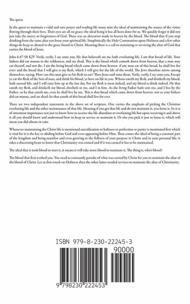 The quest. In the quest to maintain a valid and sure prayer and reading life many miss the ideal of maintaining the source of the virtue flowing through their lives. Their eyes are all on grace; the ideal being it has all been done for us. We quickly forget it did not just take the mercy or forgiveness of God. There was an altaration made in heaven by the blood. The blood that if you stop drinking from the same altar you loose your spiritual life. Simplistically the Holy Communion upon Holiness and a few other things do keep us altared to the grace found in Christ. Meaning there is a call to sustaining or servicing the altar of God that carries the blood of Jesus. John 6:47-58 KJV Verily, verily, I say unto you, He that believeth on me hath everlasting life. I am that bread of life. Your fathers did eat manna in the wilderness, and are dead. This is the bread which cometh down from heaven, that a man may eat thereof, and not die. I am the living bread which came down from heaven: if any man eat of this bread, he shall live for ever: and the bread that I will give is my flesh, which I will give for the life of the world. The Jews therefore strove among themselves, saying, How can this man give us his flesh to eat? Then Jesus said unto them, Verily, verily, I say unto you, Except ye eat the flesh of the Son of man, and drink his blood, ye have no life in you. Whoso eateth my flesh, and drinketh my blood, hath eternal life; and I will raise him up at the last day. For my flesh is meat indeed, and my blood is drink indeed. He that eateth my flesh, and drinketh my blood, dwelleth in me, and I in him. As the living Father hath sent me, and I live by the Father: so he that eateth me, even he shall live by me. This is that bread which came down from heaven: not as your fathers did eat manna, and are dead: he that eateth of this bread shall live for ever There are two independent statements in the above set of scripture. One carries the emphasis of picking the Christian everlasting life and the other maintenance of that life. Meaning if you get that life and do not maintain it; you loose it. So it is of uttermost importance not just to know how to receive the life abundant or everlasting life but upon receiving it and above it all you should know and understand how to keep or service or maintain it. Or else you pick it just to loose it, which will mean you did obtain in vain. Whenever maintaining the Christ life is mentioned sanctification or holiness or perfection or purity is mentioned first which is vital for it is the key to abiding before God and even appearing before Him. Then comes the ideal of being a constant part of the kingdom and being manifest and even growing to the fullness of your purpose in Christ and in your personal life; it takes a discerning heart to know that Christianity was earned and if it was earned it has to be maintained. The ideal that it took blood to start it, it means it will take more blood to maintain it. The thing is, who's blood? The blood that first washed you. You need to constantly partake of what was earned by Christ for you to maintain the altar of the blood of Christ. Let us first touch on Holiness then the other latter needed services to maintain the altar of Christianity.