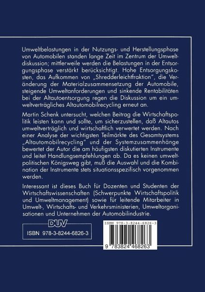 Die Umweltprobleme in der Nutzungs- und Herstellungsphase von Automobilen standen lange Zeit im Zentrum der Umweltdiskussion; mittlerweile werden die Belastungen in der Entsorgungsphase verstärkt berücksichtigt. Hohe Entsorgungskosten, das Aufkommen und die Kontamination der sogenannten "Shredderleichtfraktion", die Veränderung der Materialzusammensetzung der Automobile, steigende Umweltanforderungen und die sich hieraus ergebende sinkende Rentabilität von Aktivitäten im Zusammenhang mit der Altautoentsorgung regen die Diskussion um ein umweltverträgliches Altautomobilrecycling erneut an. Martin Schenk untersucht, welchen Beitrag die Wirtschaftspolitik leisten kann und sollte, um vor diesem Hintergrund auch zukünftig sicherzustellen, daß Altautos umweltverträglich und für alle beteiligten Akteure wirtschaftlich verwertet werden. Auf der Grundlage einer Analyse der vier wichtigsten Teilmärkte des Gesamtsystems "Altautomobilrecycling" und den daraus gewonnenen Erkenntnissen über die Systemzusammenhänge bewertet der Autor die in diesem Zusammenhang am häufigsten diskutierten Instrumente der Wirtschaftspolitik und leitet Handlungsempfehlungen für die Politik ab. Dabei zeigt sich, daß es keinen umweltpolitischen Königsweg gibt, sondern die Auswahl und die Kombination der Instrumente stets entsprechend den herrschenden Rahmenbedingungen vorgenommen werden muß.