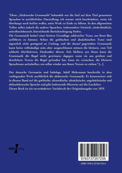 Der deutsche Germanist und Indologe Adolf Holtzmann beschreibt in dem vorliegenden Werk ausführlich die altdeutsche Grammatik. Er konzentriert sich in diesem Band auf die gothische, altnordische, altsächsische, angelsächsische und althochdeutsche Sprache und gibt bedeutende Hinweise auf die Lautlehre.