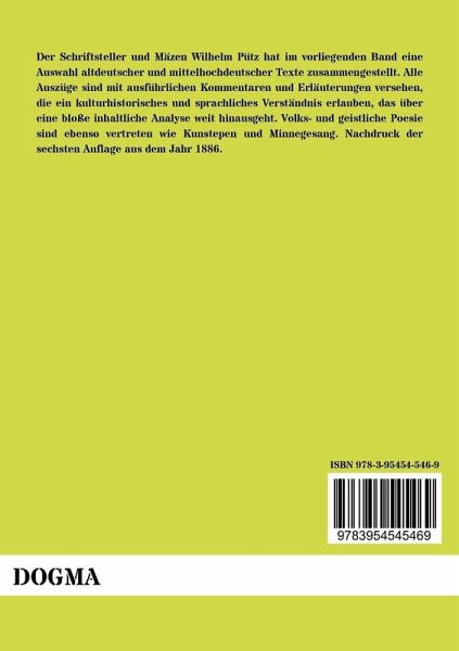 Der Schriftsteller und Mäzen Wilhelm Pütz hat im vorliegenden Band eine Auswahl altdeutscher und mittelhochdeutscher Texte zusammengestellt. Alle Auszüge sind mit ausführlichen Kommentaren und Erläuterungen versehen, die ein kulturhistorisches und sprachliches Verständnis erlauben, das über eine bloße inhaltliche Analyse weit hinausgeht. Volks- und geistliche Poesie sind ebenso vertreten wie Kunstepen und Minnegesang. Nachdruck der sechsten Auflage aus dem Jahr 1886.