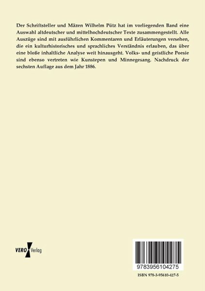 Der Schriftsteller und Mäzen Wilhelm Pütz hat im vorliegenden Band eine Auswahl altdeutscher und mittelhochdeutscher Texte zusammengestellt. Alle Auszüge sind mit ausführlichen Kommentaren und Erläuterungen versehen, die ein kulturhistorisches und sprachliches Verständnis erlauben, das über eine bloße inhaltliche Analyse weit hinausgeht. Volks- und geistliche Poesie sind ebenso vertreten wie Kunstepen und Minnegesang. Nachdruck der sechsten Auflage aus dem Jahr 1886.