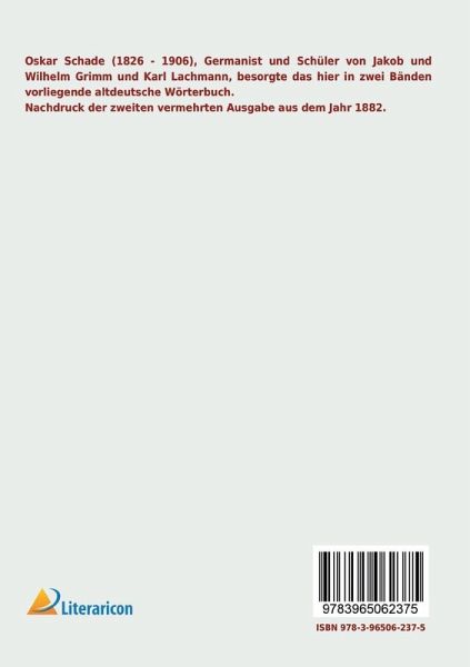 Oskar Schade (1826 - 1906), Germanist und Schüler von Jakob und Wilhelm Grimm und Karl Lachmann, besorgte das hier in zwei Bänden vorliegende altdeutsche Wörterbuch. Nachdruck der zweiten vermehrten Ausgabe aus dem Jahr 1882.