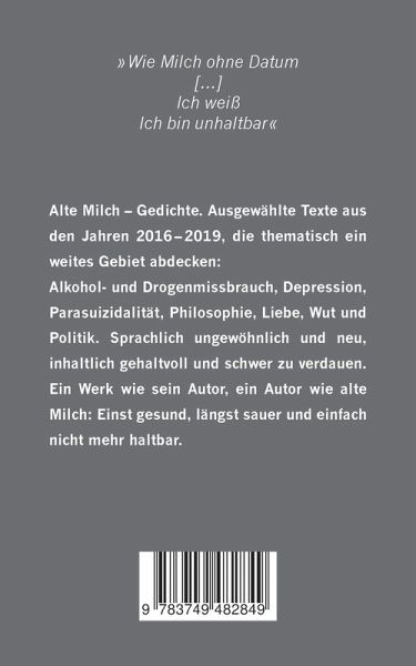 Alte Milch: Gedichte. Ausgewählte Texte aus den Jahren 2016-2019, die thematisch ein weites Gebiet abdecken: Alkohol- und Drogenmissbrauch, Depression, (Para-)Suizidalität, Philosophie, Liebe, Wut und Politik. Sprachlich ungewöhnlich und neu, inhaltlich gehaltvoll und schwer zu verdauen. Ein Werk wie sein Autor, ein Autor wie Alte Milch: Einst gesund, längst sauer und einfach nicht mehr haltbar.