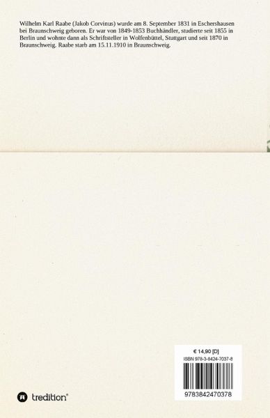 Wilhelm Karl Raabe (Jakob Corvinus) wurde am 8. September 1831 in Eschershausen bei Braunschweig geboren. Er war von 1849-1853 Buchhändler, studierte seit 1855 in Berlin und wohnte dann als Schriftsteller in Wolfenbüttel, Stuttgart und seit 1870 in Braunschweig. Raabe starb am 15.11.1910 in Braunschweig.