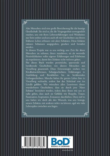 Alte Menschen sind eine große Bereicherung für die heutige Gesellschaft. Sie sind es, die die Vergangenheit unvergesslich machen, uns mit ihren Lebenserfahrungen und Weisheiten zur Seite stehen und uns auch oft mit Geschichten aus ihrem früheren Leben erfreuen: mit alten Schätzen. Diese Schätze müssen behutsam ausgegraben, gesehen und bewahrt werden.In diesem Projekt war es uns wichtig, uns Zeit für ältere Menschen zu nehmen, ihnen zuzuhören, sie als wertvolle Persönlichkeiten voller eigener Erfahrungen und Erlebnisse zu respektieren, damit ihre Schätze nicht verloren gehen.Für dieses Buch wurden persönliche, spannende und berührende Geschichten von älteren Menschen aus Vorarlberg gesammelt. Diese Erinnerungen reichen von Kindheitserlebnissen, Schulgeschichten, Erfahrungen in Ausbildung und Berufsleben bis zu berührenden Liebesgeschichten. Manche haben ihr ganzes Leben hier in Vorarlberg verbracht, andere hat das Schicksal erst ins Ländle geführt.Wir wünschen allen Leserinnen dieser wunderbaren Geschichten, dass sie durch jene "Alten Schätze" bereichert werden, indem diese ihnen wie uns so nahe gehen, dass auch sie Gefühle wie Respekt, Trauer, Faszination, Inspiration, Erstaunen durchleben. Denn tief in uns haben wir doch alle den Wunsch, was uns bewegt, unsere Schätze, mit anderen teilen zu können, egal wie viele Lebensjahre zwischen uns liegen.