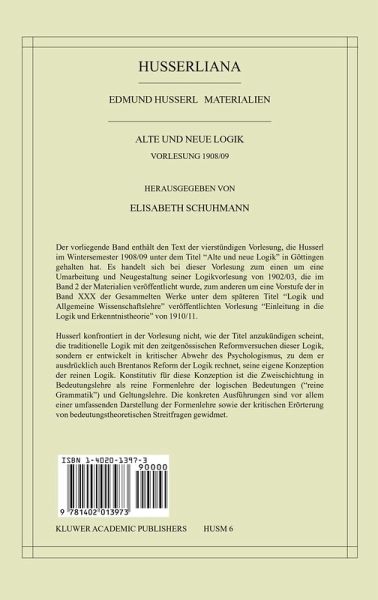 Der vorliegende Band enthält den Text der vierstündigen Vorlesung, die Husserl im Wintersemester 1908/09 unter dem Titel "Alte und neue Logik" in Göttingen gehalten hat. Es handelt sich bei dieser Vorlesung zum einen um eine Umarbeitung und Neugestaltung seiner Logikvorlesung von 1902/03, die im Band 2 der Materialien veröffentlicht wurde, zum anderen um eine Vorstufe der in Band XXX der Gesammelten Werke unter dem späteren Titel "Logik und Allgemeine Wissenschaftslehre" veröffentlichten Vorlesung "Einleitung in die Logik und Erkenntnistheorie" von 1910/11.