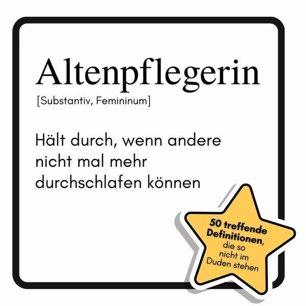 Wenn andere längst am Limit sind, beginnt hier erst der Spaß: "Altenpflegerin: Hält durch, wenn andere nicht mal mehr durchschlafen können" zeigt mit 50 witzigen Definitionen und Illustrationen, wie viel Humor, Herz und Durchhaltevermögen im Pflegealltag stecken. Von der legendären Lächelreserve bis zum gefürchteten Dienstplan - dieses Buch bringt auf den Punkt, was den Beruf so besonders macht.Für wen dieses Buch perfekt ist:- Für alle, die in der Pflege arbeiten oder jemanden kennen, der es tut- Für Fans von Alltagskomik mit Tiefgang- Für Menschen, die wissen wollen, was wirklich hinter den Kulissen eines Pflegeheims passiertEin Geschenk, das Wertschätzung und ein Lächeln schenkt - und zeigt, dass Pflegekräfte mehr als nur Multitasking-Profis sind.Was dieses Buch bietet:- 50 humorvolle Definitionen aus dem Pflegealltag- Passende Illustrationen zu jedem Begriff- Einblicke in die Welt der Altenpflege mit Augenzwinkern- Ideales Geschenk für Pflegekräfte und ihre Fans