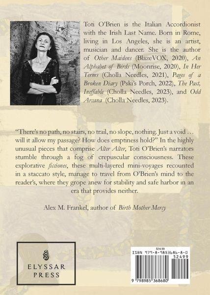 TOTI O'BRIEN is the Italian Accordionist with the Irish last name. She was born in Rome, Italy, raised in Sicily and France. After touring Europe and Brazil with her itinerant theater, in the early nineties, she established herself in Los Angeles where she makes a living as a self-employed artist, performing musician and professional dancer. O'Brien's first book of stories, Africa, was published in 1990. It was followed by another short story collection, Reversed Memories, two illustrated children books and an essay collection, Lanterna Magica, gathering selected work out of her long-term collaboration with Italian journals and magazines. O'Brien started writing in the English language in 2004. Since then, her poetry, fiction and non-fiction were published in hundreds of journals and anthologies in the US, UK, Ireland, Canada, India, Australia, and all over the world. Her most recent appearances include The Moth, The Hamilton Stone, The Los Angeles Review of Books, and World Literature Today. Her poetry collection Other Maidens (BlazeVOX, 2020) and a prose collection, Pages of a Broken Diary (Pskj's Porch, 2021), are about to be released. Her work was nominated for Best of the Net, Best Small Fiction, Best American Essay, the Pushcart, and various other prizes. Her memoir 'Nicotine' won a nonfiction prose award in 2018. Her essay 'Blur In The Front Line' won the Anthony Award in 2016. Besides her creative writing, she contributes articles and reviews about art, music, film, literature and civilization to several magazines. She also translates poetry and prose from the Italian, the Spanish, and the French. O'Brien's multimedia artwork was exhibited in group and solo shows in Europe and the US, since the early nineties. Her paintings, sculptures, collages and textiles were featured in many publications, and she has produced book covers and illustrations.